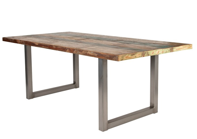 Die Tischplatte ist aus massivem Altholz bunt lackiert. Das Gestell ist aus Stahl und antiksilber.