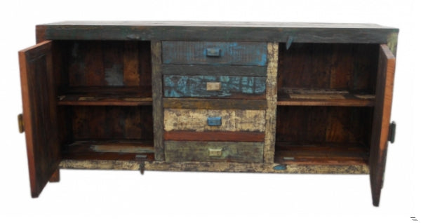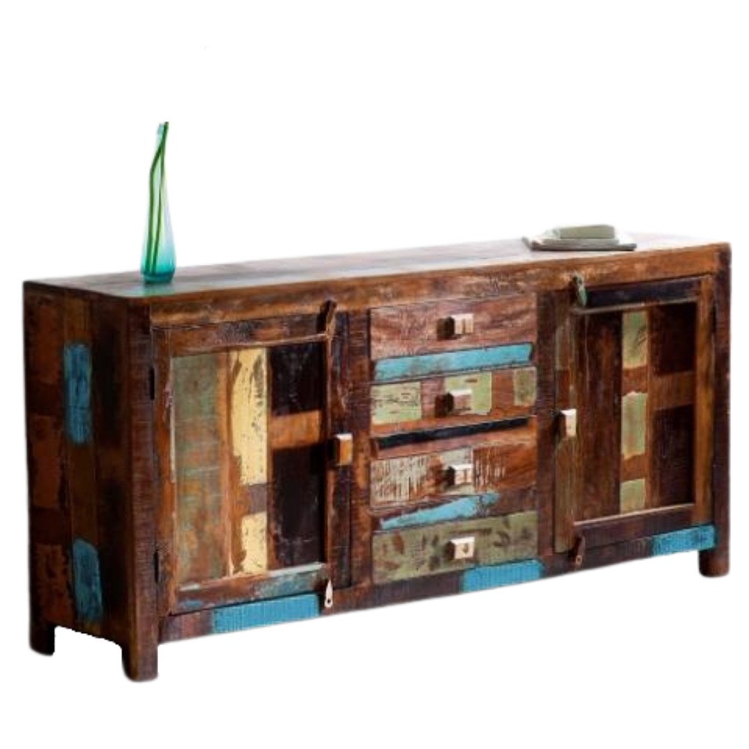 Verleihe deinem Wohnraum einen Hauch von Vintage-Glamour mit unserem exquisiten Sideboard, sorgfältig gefertigt aus massivem Altholz. Dieses Stück bringt nicht nur Geschichte und Charakter in dein Zuhause, sondern bietet dank seiner zwei Türen und vier Schubladen auch eine optimale Lösung für all deine Aufbewahrungsbedürfnisse.