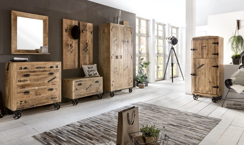 Dieser Artikel ist aus edlem massivem Mangoholz, antikfinish. Der Artikel ist mit starken Gebrauchsspuren und antik getrimmten Beschlägen versehen. Das Möbelstück wurde von traditionellen Handwerkern handgefertigt und hat eine Herstellungsdauer von 3 bis 4 Tagen.