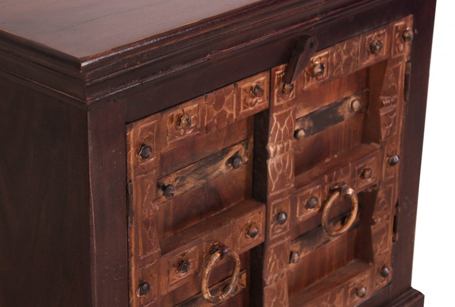 Kolonial Unterschrank aus recycltem Altholz mit aufwendigen Schnitzereien und Metallapplikationen