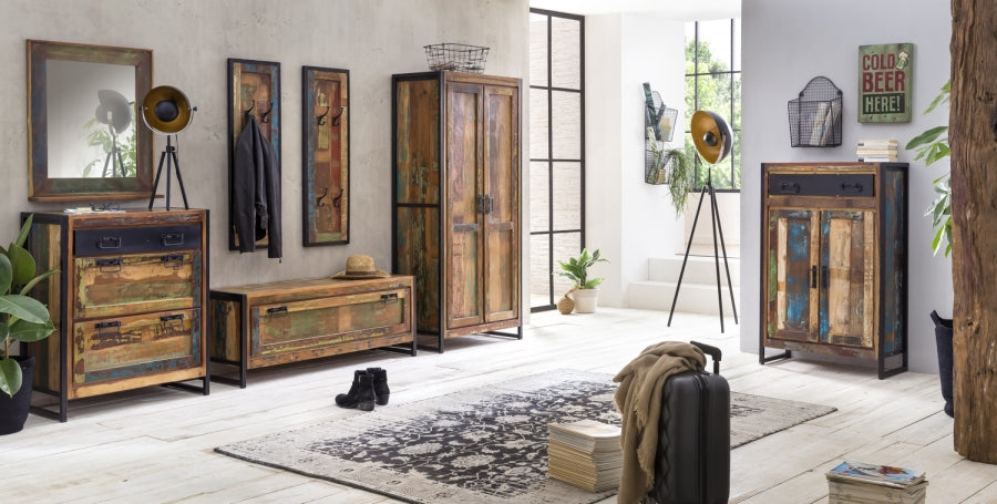 Dieser Artikel ist aus recyceltem massivem Altholz und Altmetall. Die Farbfronten sind bei jedem Artikel individuell, da jedes Möbelstück ein Unikat ist. Die Bilder sind nur Beispielbilder. Jedes Möbelstück hat unterschiedliche Farben.