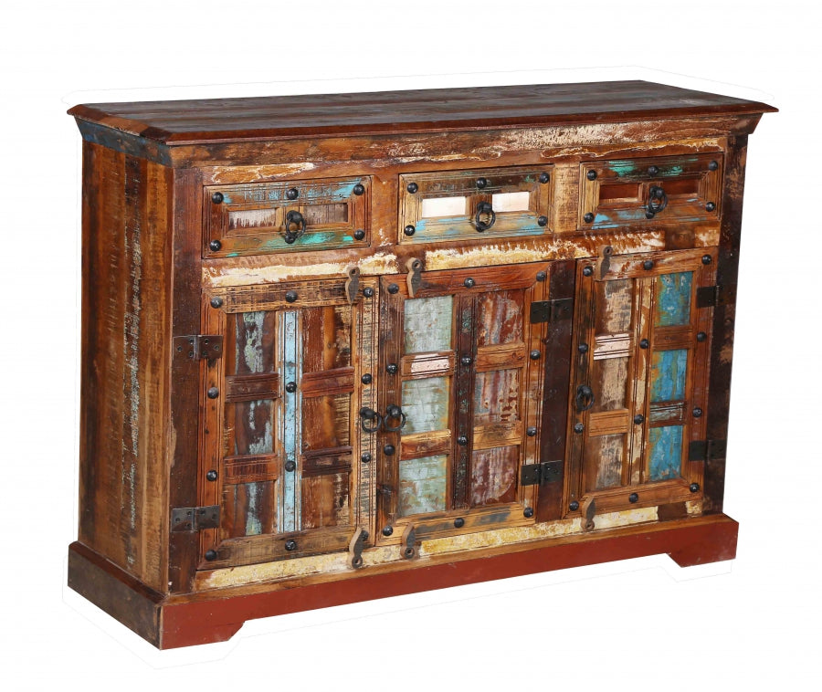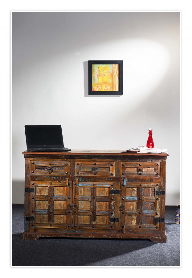 Entdecke die perfekte Symbiose aus Funktionalität und einzigartigem Design mit unserer Vintage Kommode, die sorgfältig aus massivem Altholz gefertigt wurde. Dieses exquisite Möbelstück, bereit, sofort in deinem Heim einen Platz zu finden, bietet mit seinen drei Schubladen und drei Türen genügend Stauraum für all deine Schätze und Alltagsgegenstände. Jede Kommode ist durch ihre individuellen Farbfronten ein echtes Unikat, das deinem Wohnraum Persönlichkeit und Charme verleiht.