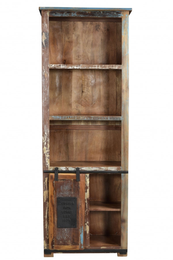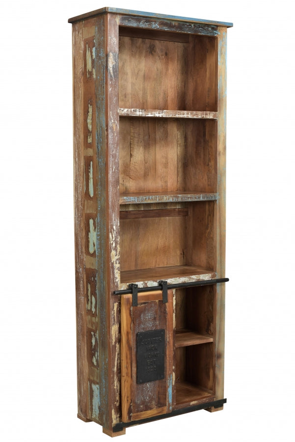 Erwecke Deine Leidenschaft für Bücher zum Leben und präsentiere Deine Sammlung stilvoll mit unserem Vintage Bücherregal aus massivem Altholz, akzentuiert durch elegante Metallelemente. Dieses handgefertigte Regal, mit fünf großzügigen Fächern und einer praktischen Schiebetür, bietet Dir nicht nur ausreichend Platz für Deine literarischen Schätze, sondern fügt sich auch als markantes Möbelstück in Dein Zuhause ein.