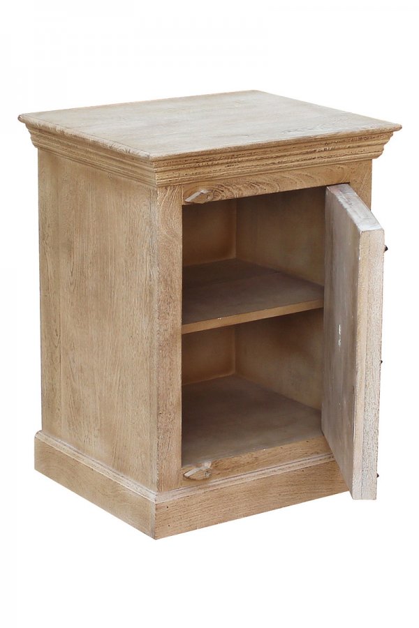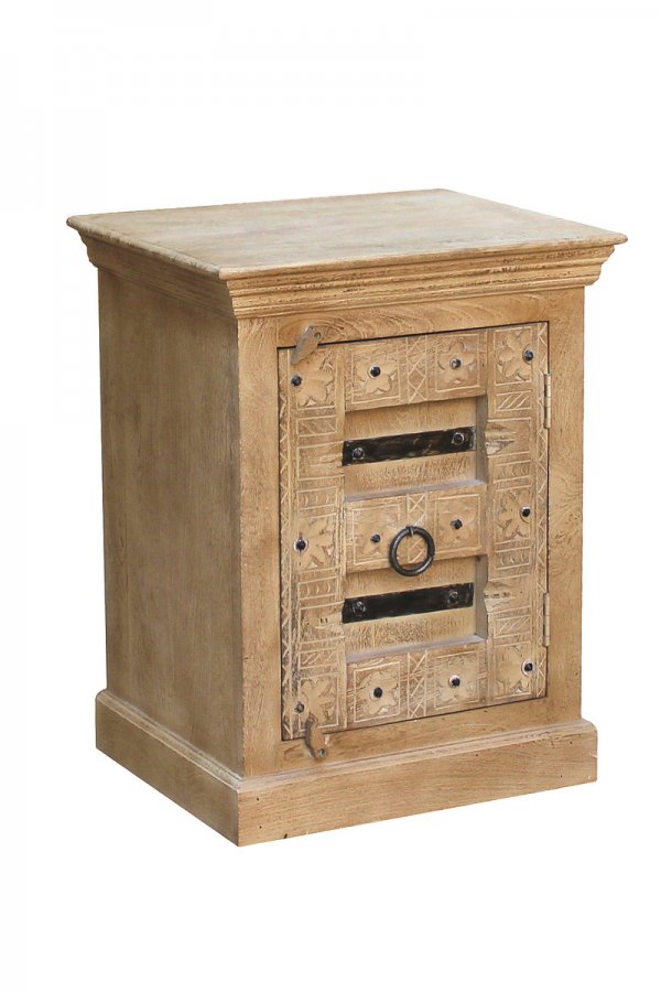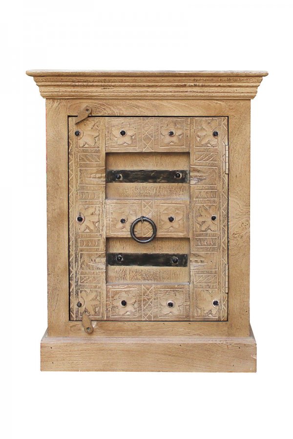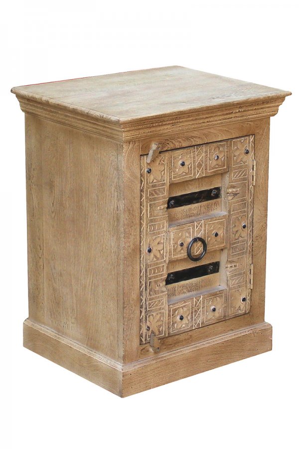 Aufwändige Schnitzereien auf Mangoholz mit Metallapplikationen geben der Front dieser Nachtkonsole den für Indien typisch antik kolonialen Look. Hinter der Tür der Nachtkommode befindet sich Platz für Bücher und private Dinge. Eine ausreichende Fläche für Nachttischlampe, Wecker, Bücher, Lesebrille usw. bietet die Deckplatte. Der Nachtschrank lässt sich auch prima als Einzelstück in weiteren Wohnräumen aufstellen z. B. als Dielenschrank oder kleine Flurkommode und kann dort mit ihrem Charme ganz groß rauskommen. Die Kommode ist kombinierbar mit modernen Möbeln in Schlafzimmern. Das Schränkchen würde seine Wirkung in kleinen Single-Haushalten als Nischenfüller ebenso entfalten.