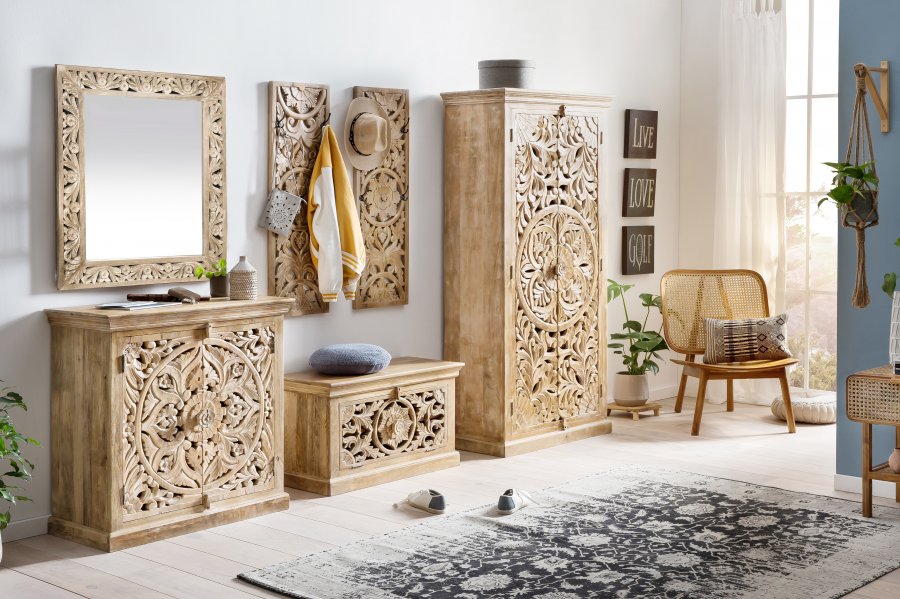 Wir beziehen diese Möbel aus dem über 10.000 km entfernten Wüstenstaat Rajasthan in Indien von verschiedenen Herstellern. Die Ware erreicht unser Lager per Seecontainer in Deutschland und wird dann vom Hafen per Bahn kombiniert mit LKW geliefert. Von unserem Lager aus werden die Möbel aus Sicherheitsgründen – um Transportschäden zu vermeiden – von Speditionen bei uns geladen und direkt zu Ihnen gebracht.