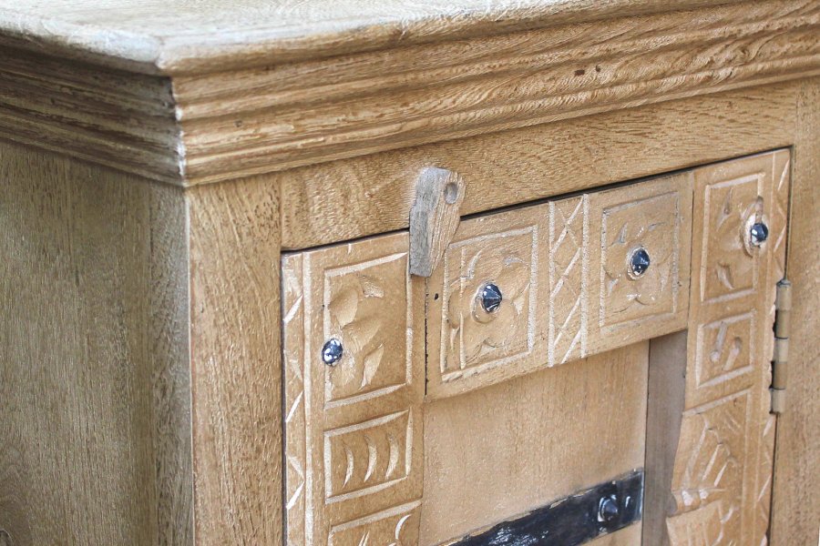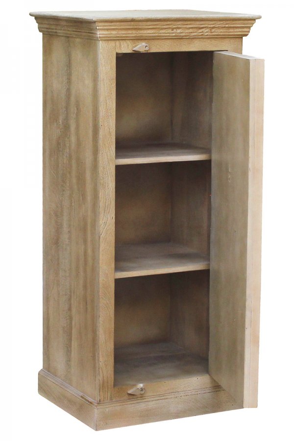 Ein Schrank, welcher Ihnen das Gefühl gibt, Ferien in Indien zu erleben. Aufwändige Schnitzereien auf Mangoholz mit Metallapplikationen geben der Front des auch als Bücherschrank nutzbaren Schranks den für Indien typisch antik kolonialen Look. Der kleine Hochschrank kann durch seine blickdichte Tür und 2 feste Böden in vielerlei Räumen zum Einsatz kommen: ob als zusätzlicher Wäscheschrank im Bad, kleine Kommode im Schlafzimmer, Apothekerschrank, Aktenschrank - seiner Nutzbarkeit sind so gut wie keine Grenzen gesetzt. Als Einzelstück ein absoluter Blickfang und schmückt auch Diele und Flurbereich als Dielenschrank. Die Deckplatte eignet sich ebenfalls für Accessoires oder Zimmerpflanzen. Wer die Antike mag, wird dieses Möbel in seinem dunklen Holz mit seinen gewollten Gebrauchspuren lieben, denn dieses Schränkchen ist auch mit modernem Mobiliar kombinierbar und verliert dabei seinen einzigartigen Charme nicht.