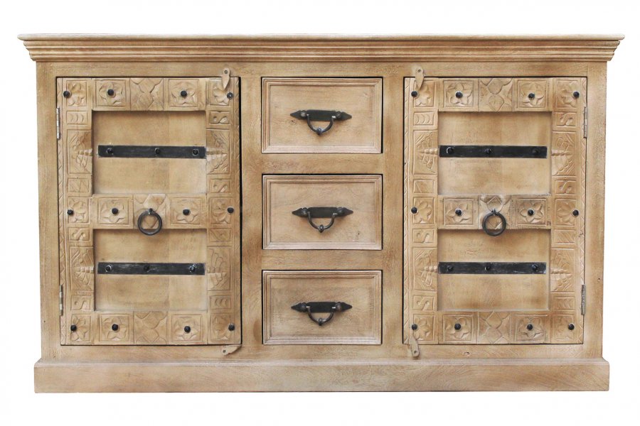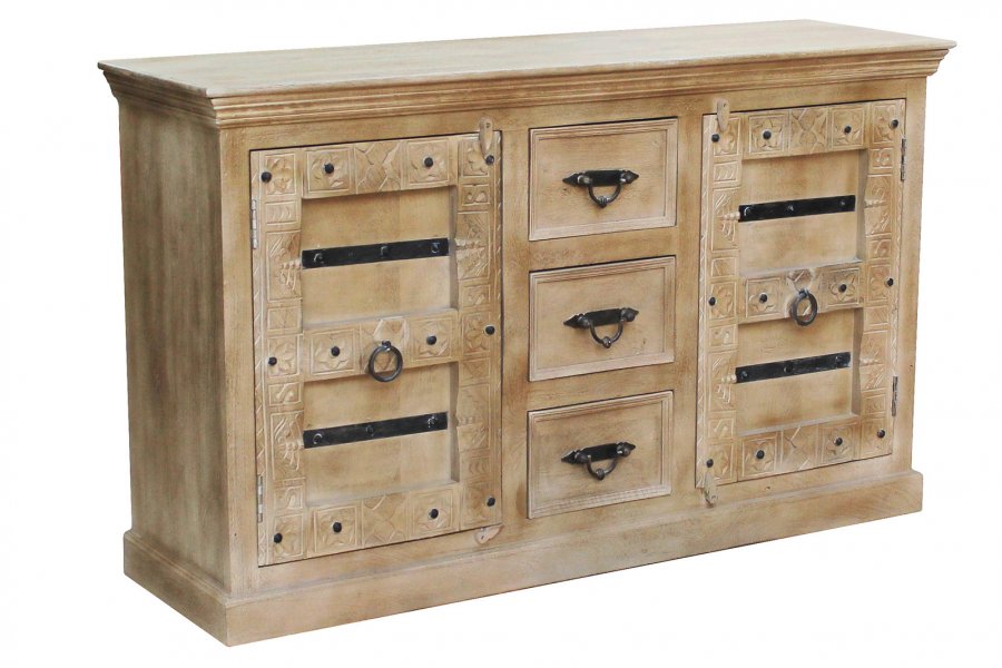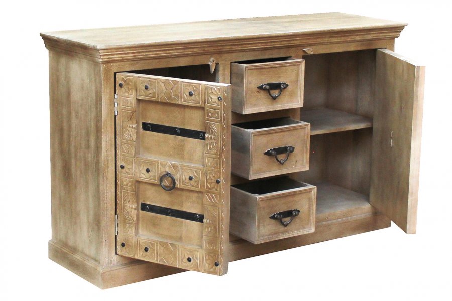 Ein Sideboard, welches Ihnen das Gefühl gibt, Ferien in Indien zu erleben. Aufwändige Schnitzereien auf Mangoholz mit Metallapplikationen geben der Front der Anrichte den für Indien typisch antik kolonialen Look. Der halbhohe Schrank bietet genügend Stauraum hinter 3 Türen mit je einem festen Einlegeboden und in 3 Schubkästen für vielerlei Dinge. Die Deckplatte eignet sich auch für größere Vasen und lässt die Schönheit des antik kolonialen anmutenden Buffets erst zur Geltung kommen. Gewollte Gebrauchsspuren geben dem Kommodenschrank einen zusätzlichen Reiz. Die Kommode kann sowohl in einem Wohnraum mit modernem Mobiliar kombiniert werden als auch in einer Diele als Dielenschrank ihren Charme zum Ausdruck bringen.
