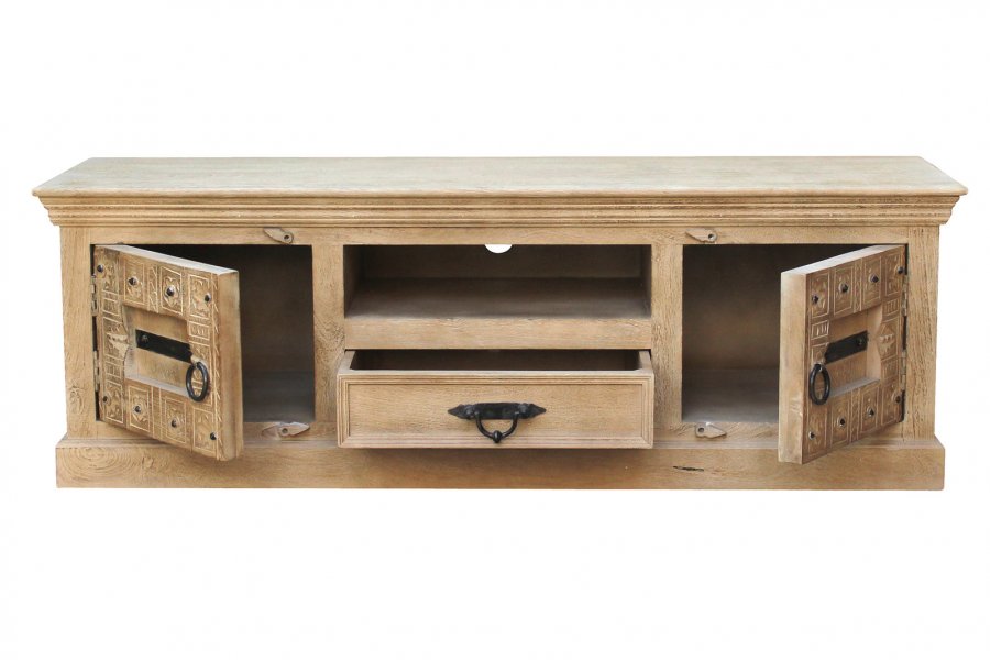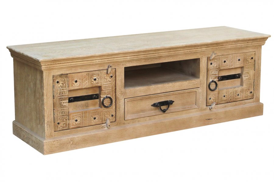 Ein Lowboard, welches Ihnen das Gefühl gibt, Ferien in Indien zu erleben. aufwändige Schnitzereien auf Mangoholz mit Metallapplikationen geben der Front des TV-Schranks den für Indien typisch antik kolonialen Look. Der handgefertigte Schrank bietet genügend Stauraum hinter 2 Türen, 1 offenem Fach sowie einem Schubkasten für DVD-Player, Spielekonsolen, Receiver, Verstärker, Fernbedienungen usw. Die TV-Kommode lässt sich durch entsprechende Accessoires wunderbar in Szene setzen und lässt die Schönheit der antik kolonialen anmutenden Multimedia-Kommode erst zur Geltung kommen. Gewollte Gebrauchsspuren geben dem Kommodenschrank einen zusätzlichen Reiz. Die Kommode kann sowohl in einem Wohnraum mit modernem Mobiliar und Wohnlandschaften kombiniert werden und ihren Charme zum Ausdruck bringen.