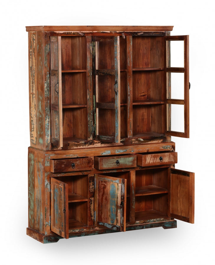 Dieses Prachtstück vereint die robuste Schönheit von Altholz mit dem funktionalen Design moderner Wohnkultur. Mit seinen drei Schubladen und sechs Türen bietet dieses Buffet nicht nur reichlich Stauraum für Geschirr, Tischwäsche und Dekorationsartikel, sondern dient auch als eindrucksvoller Blickfang in deinem Wohn- oder Essbereich.